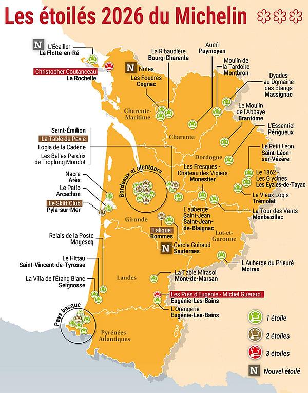 Op maandag 16 maart 2026 vond in Monaco de uitreiking van de Michelinsterren plaats. De nieuwe ranglijst is bekendgemaakt. Opvallend: vier rode sterren, twee groene sterren en een patissier zijn bekroond. Er zijn 61 sterrenrestaurants in Sud-Ouest-Frankrijk.